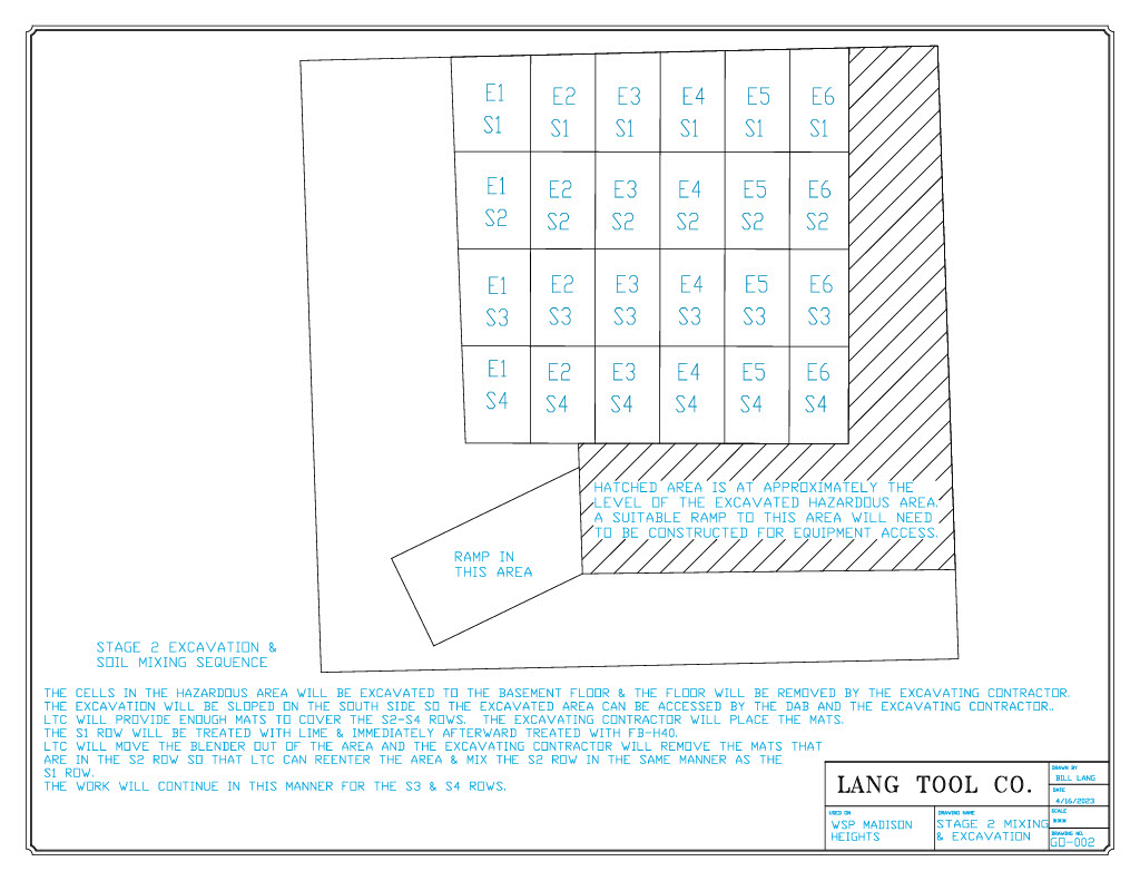Stage 1 was treating the area in the drawings above with 5% FerroBlack-HCZ & 1% Powdered Activated Carbon in a 30% solution. Note that there were two different mixing intervals- 8-11’ below monitoring well PM02 and 3-11’ below the well. ASI performed the excavation prior to the commencement of soil mixing. This portion of the mixing was completed in 5 working days. After this stage of mixing was completed there was a two week waiting period for the chemical reaction to complete. The area was then treated with 5.3% Portland cement and left in place. The stabilization with cement was completed in two working days.